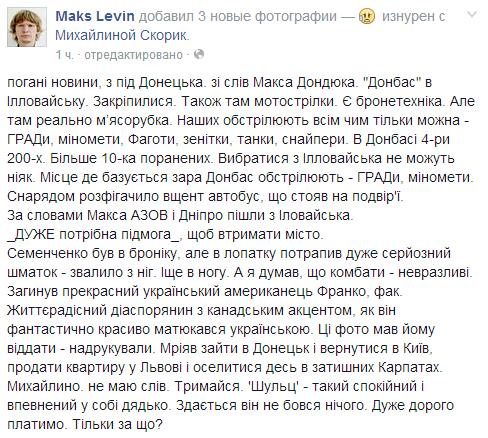 - "Плохие новости, из-под Донецка. Со слов Макса Дондюка, "Донбасс" в Иловайске закрепились. Также там мотострелки. Есть бронетехника. Но там реально мясорубка. Наших обстреливают всем, чем только можно, - Грады, минометы, Фаготы, зенитки, танки, снайпера. В "Донбассе" четыре 200-х. Больше 10-ка раненых. Выбраться из Иловайска не могут никак. Место, где базируется сейчас "Донбасс" обстреливают - Грады, минометы. Снарядом расфигачило дотла автобус, что стоял на дворе", - написал он.